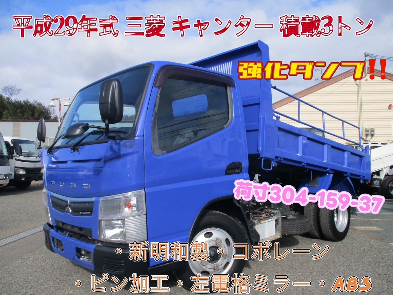 平成29年式 三菱 キャンター 3トン 強化ダンプ 全低床 MT コボレーン ピン加工 ロープフック ABS 左電格ミラー オーバーヘッドコンソール レベライザー 新明和製 DR2-0110SY ★お問い合わせ番号3467★