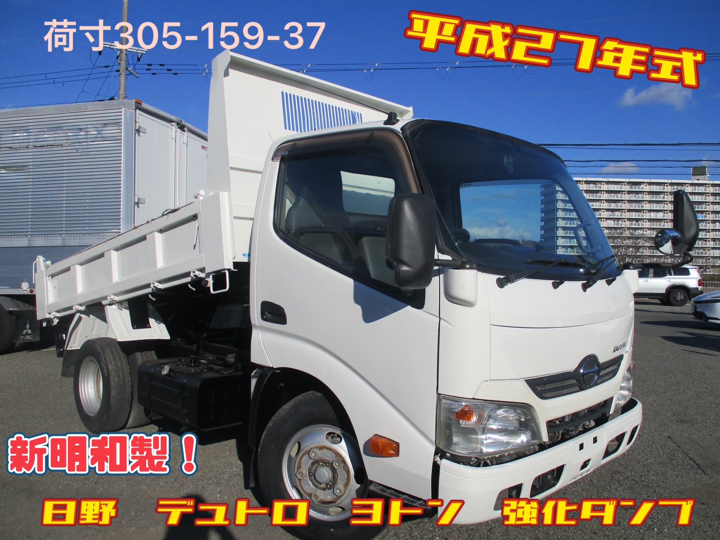 平成27年式 日野 デュトロ 積載3トン 強化ダンプ 新明和製 全低床 5速MT コボレーン ピン加工2箇所 レベライザ ロープフック アイドリングストップ ETC 左電格ミラー 横滑り防止装置 荷台塗装 スペアタイヤ ターボ 136馬力 地上高:85cm タイヤサイズ:195/85R16 NOX適合 ★お問い合わせ番号:9025★