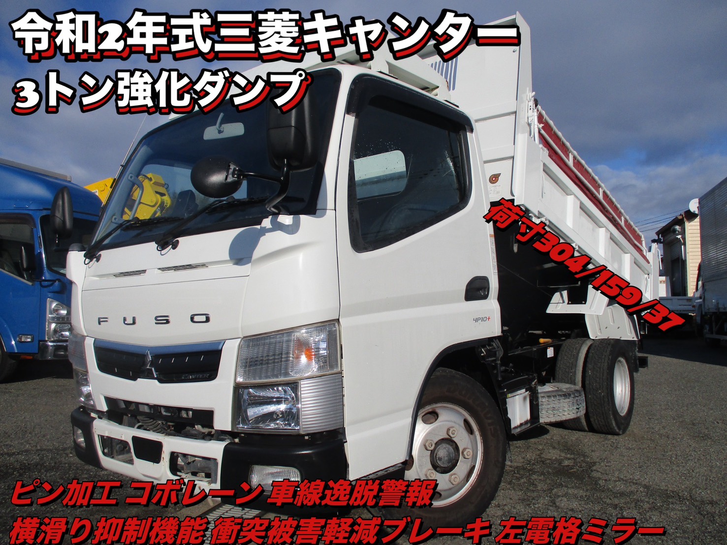 令和2年式 三菱 キャンター 積載3トン 強化ダンプ 高床 5速MT コボレーン ピン加工2カ所 荷寸304-159-37 4ナンバー ETC 150馬力 新明和製 DR2-0110SY ピン 左電格ミラー 衝突被害軽減ブレーキ ルーフキャリア ABS コボレーンシート 車線逸脱警報装置 横滑り抑制機能 盗難防止システム 小型 PS PW エアバック 集中ロック スペアタイヤ オーバーヘッドコンソール レベライザー ターボ 地上高92cm タイヤサイズ:195/85R16 NOX適合 ★お問い合わせ番号:3533★