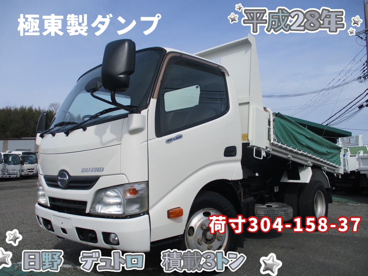 平成28年式 日野 デュトロ 積載3トン ダンプ 全低床 5速MT コボレーン 極東製 形式:DD02-31 荷寸304-158-37 4ナンバー ETC バックカメラ ドライブレコーダー エコモード 左電格ミラー 荷台塗装 アシストアイドルアップ ターボ 136馬力 横滑り防止装置 コボレーンシート 坂道発進補助装置 タイヤサイズ:195-85R16 地上高87cm NOX適合 ★お問い合わせ番号:9315★