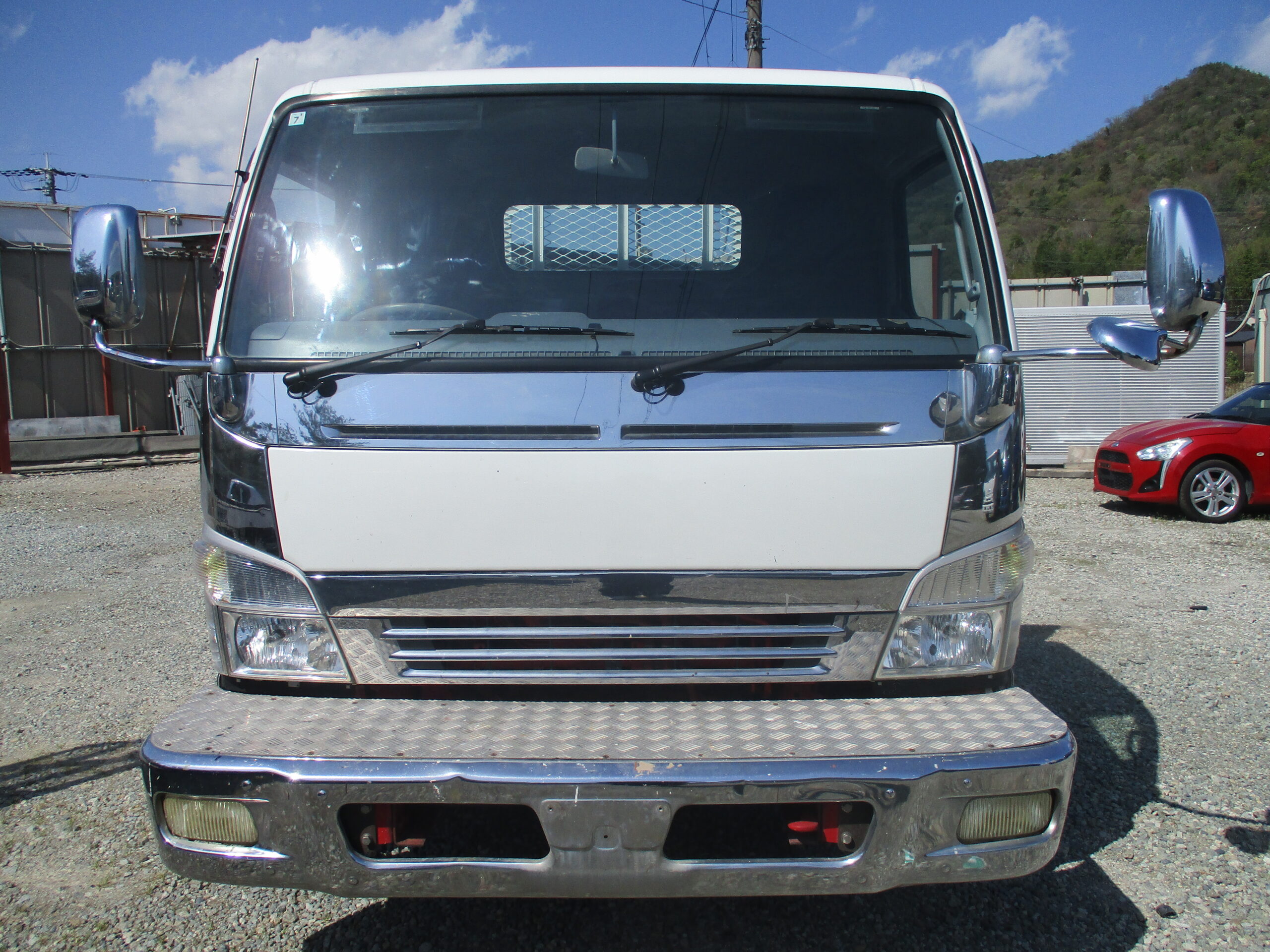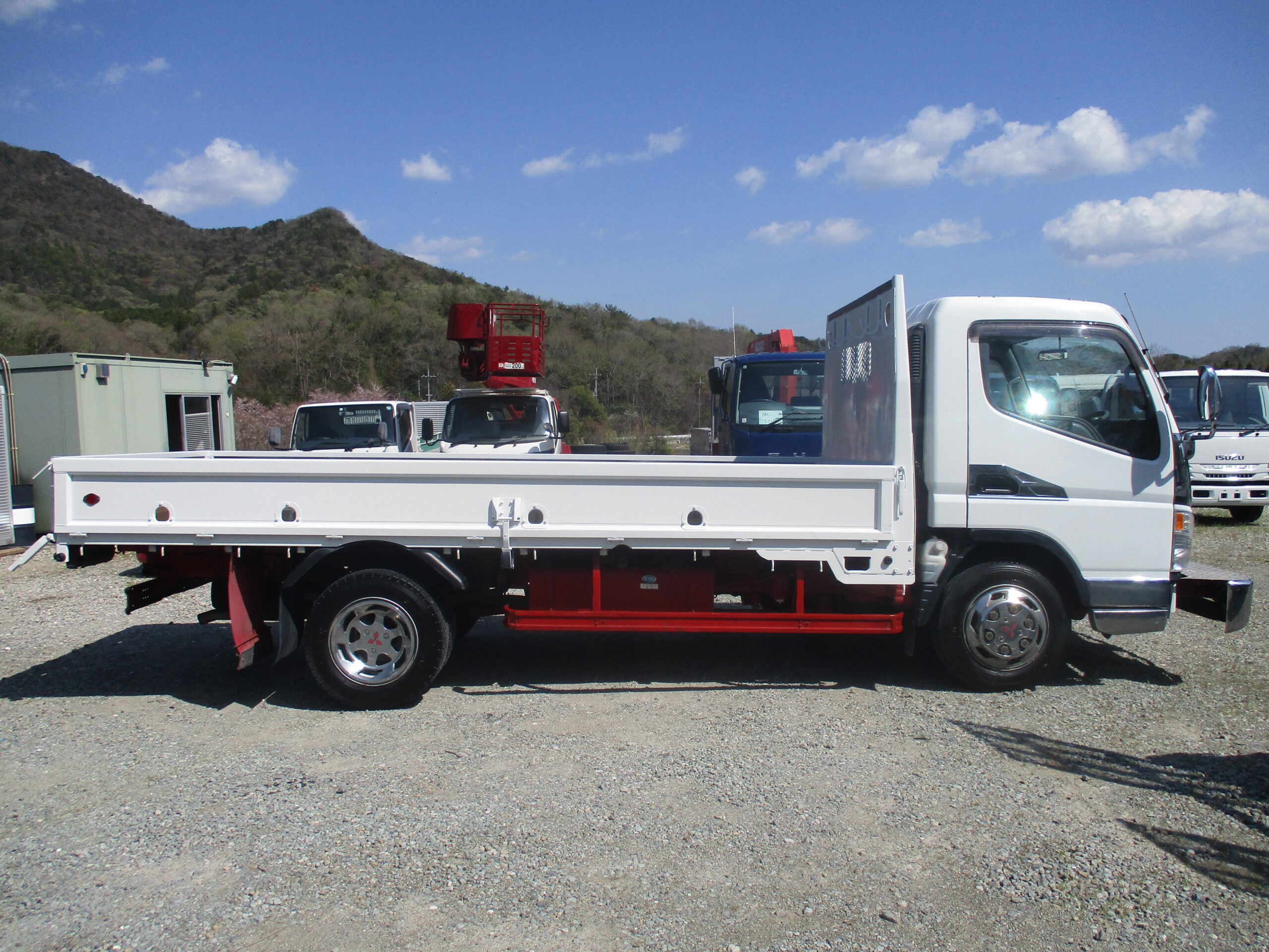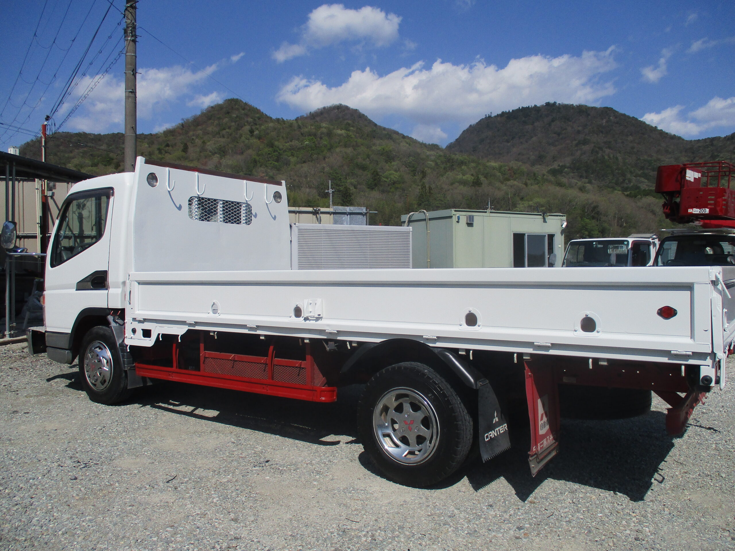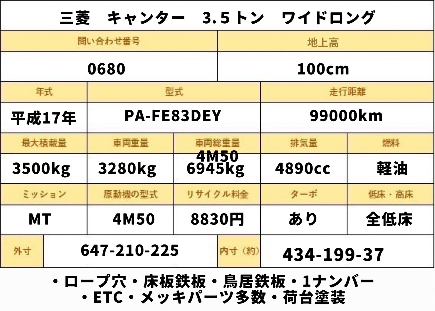 平成17年式 三菱 キャンター 積載2トン ワイドロング 全低床 6速MT 荷寸434-199-37 ETC 床板鉄板 鳥居鉄板 メッキパーツ 国産エンジン 4M50 ロープ穴左右3対/後2ヵ所 左電格ミラー 荷台塗装 ★お問い合わせ番号:0680