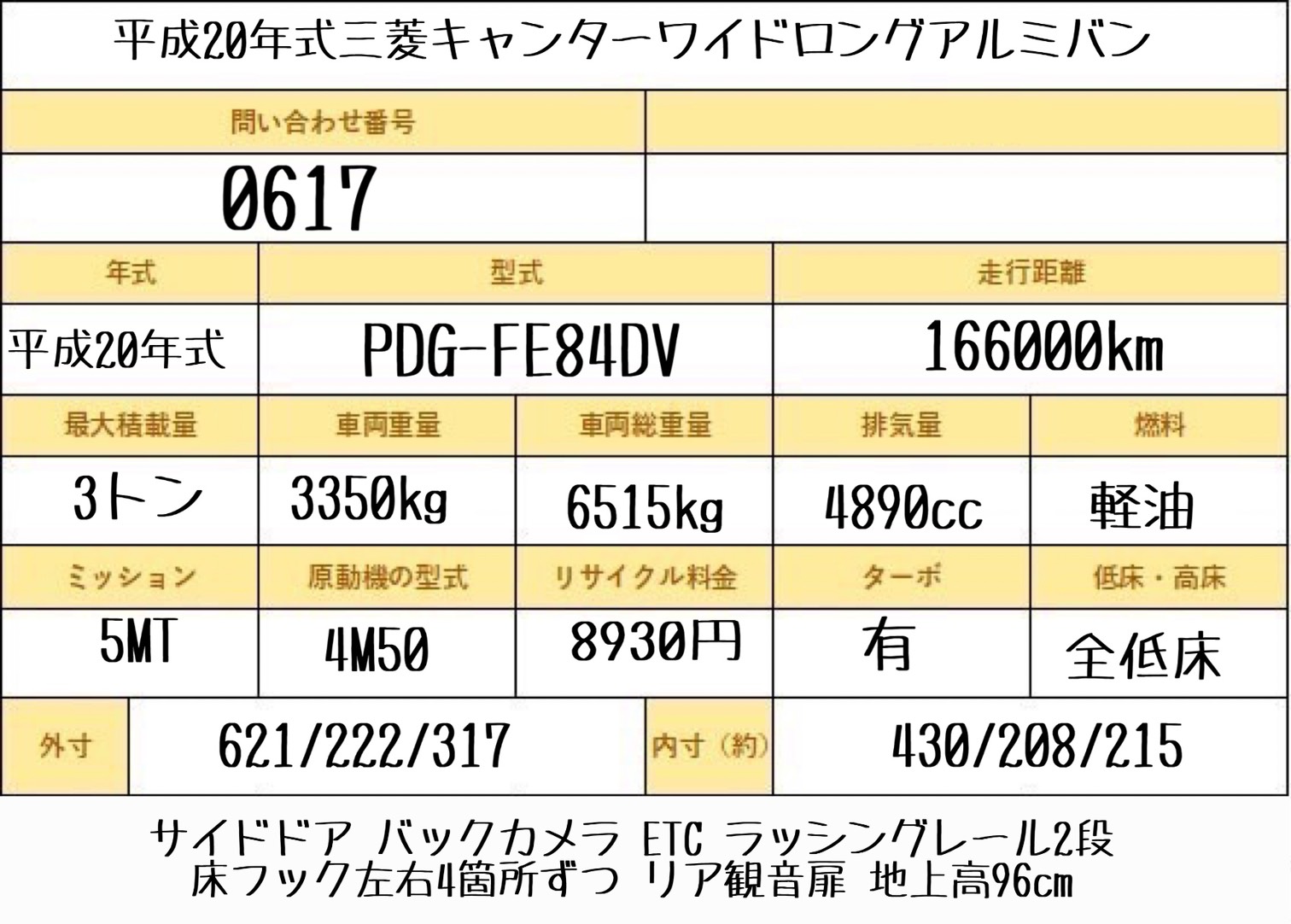 平成20年式 三菱/キャンター 積載3トン 日本フルハーフ製/アルミバン ワイドロング サイドドア 5速MT 荷寸430-208-215 ・バックカメラ・ETC・ドライブレコーダー・ラッシングレール2段・床フック左右4カ所ずつ・リア観音扉 ★お問い合わせ番号:0617★