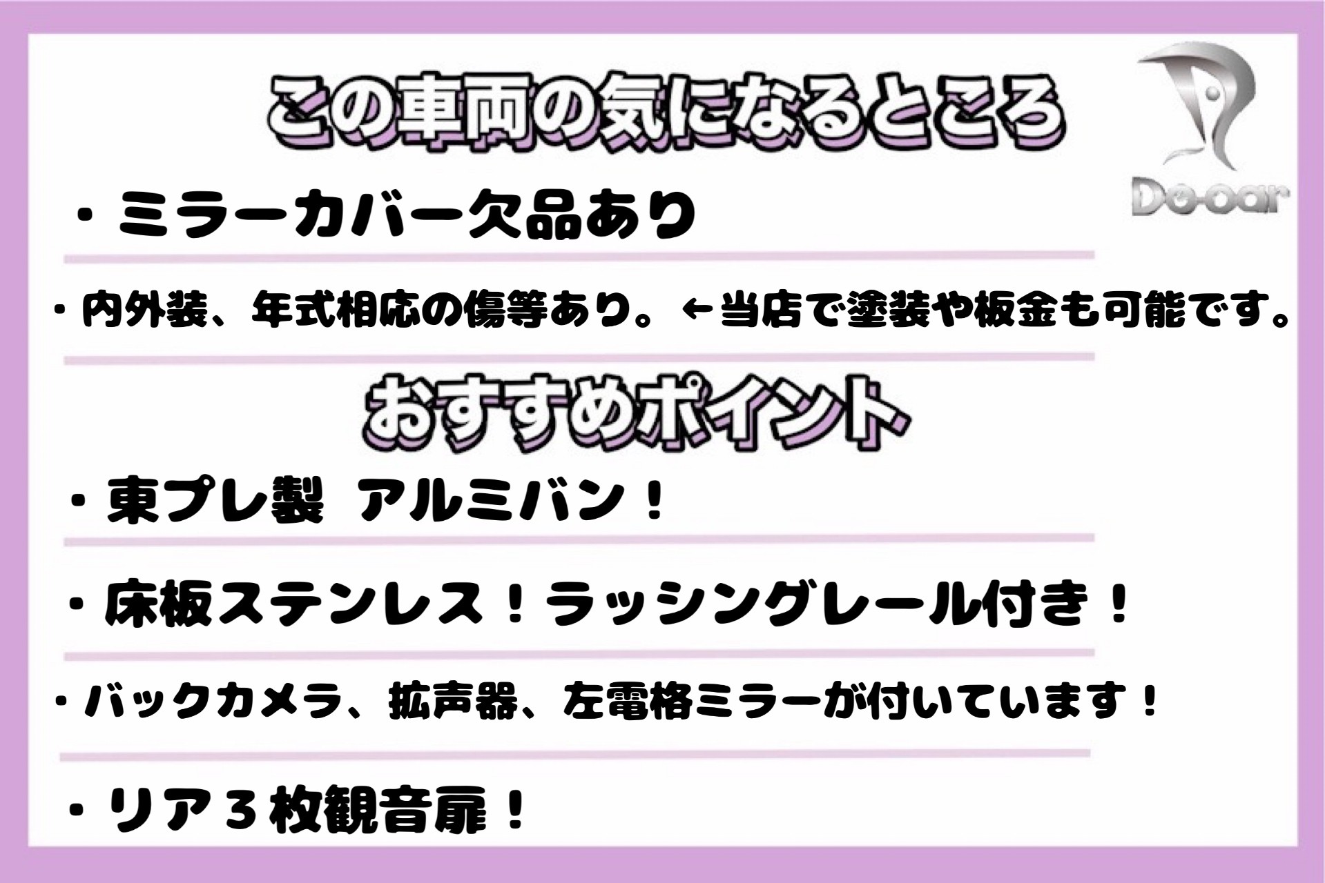・掲載車輌はあくまでも中古車でございますので、車両状態に関するご判断は各自個人差があります。