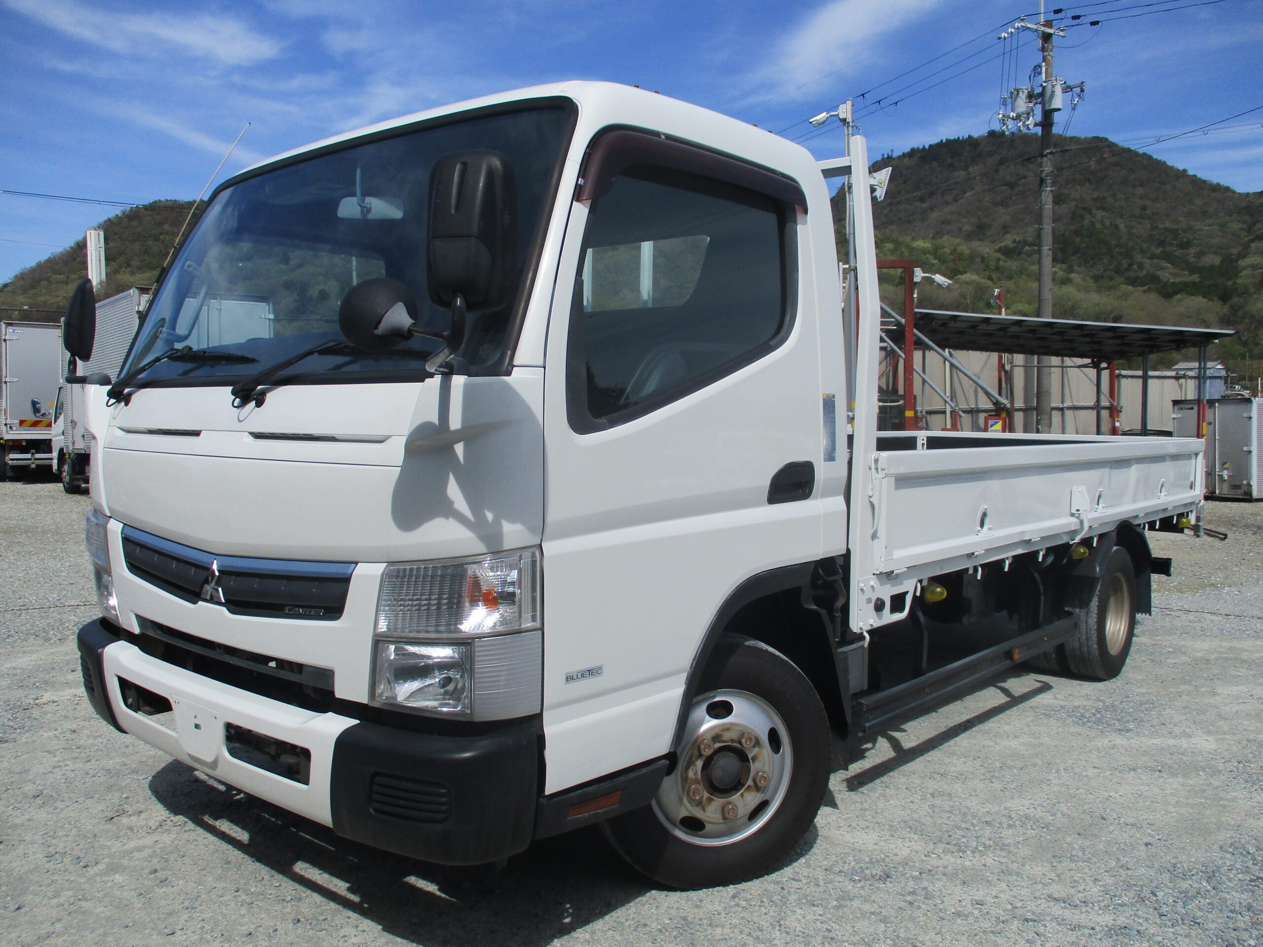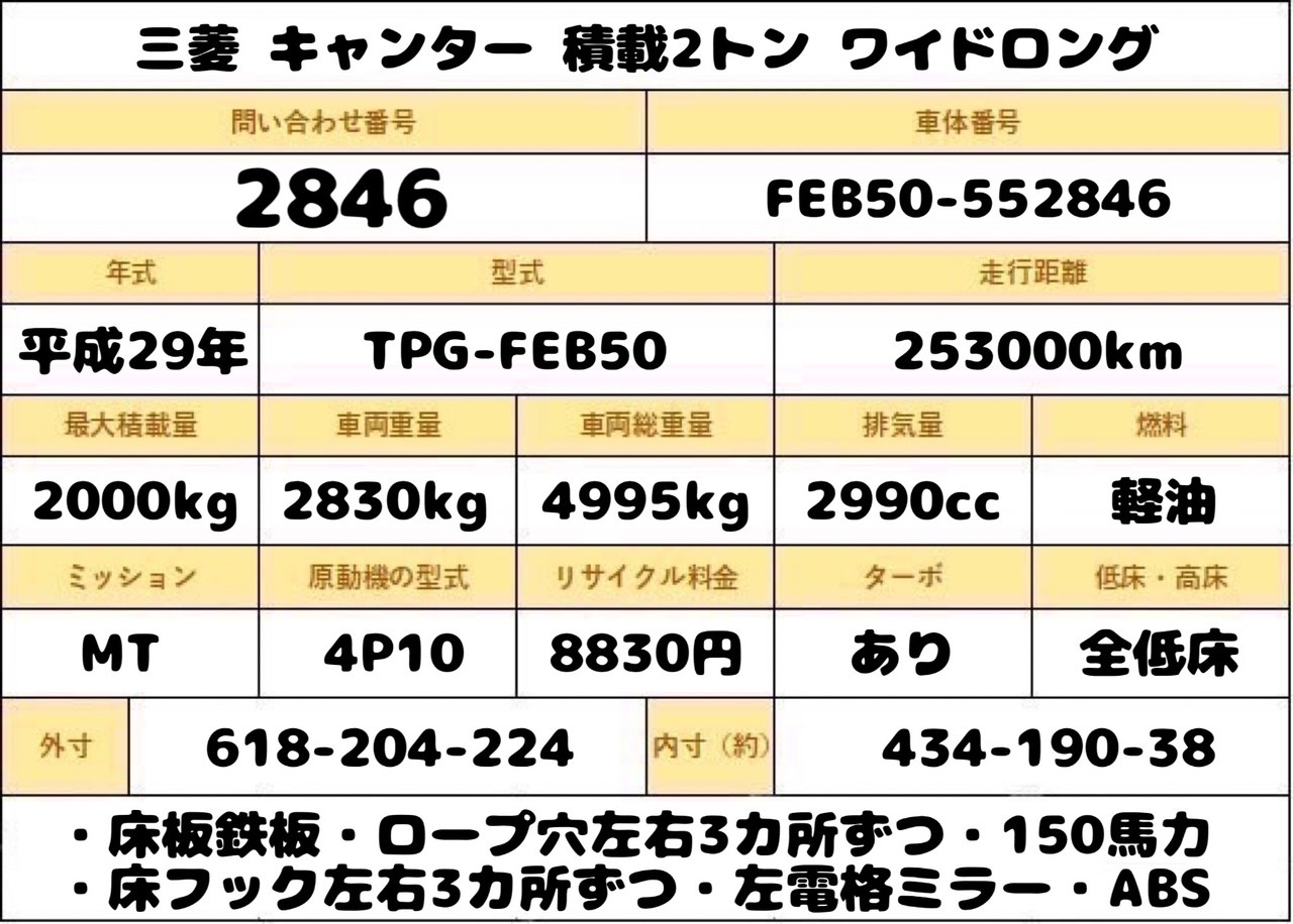 平成29年式 三菱/キャンター 積載2トン ワイドロング 全低床/5速MT 荷寸434/190/38 ロープ穴/床フック/左電格ミラー/床板鉄板 ★お問い合わせ番号:2846★