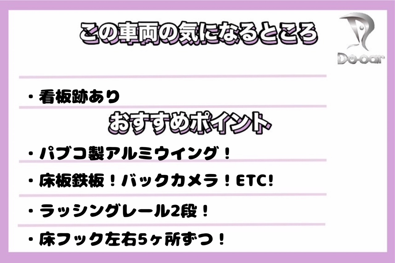 ・NOX / PM適合・エアコン・パワステ・パワーウィンドウ・エアバック・パブコ製・床板鉄板・ラッシングレール2段・床フック左右5箇所対・リア観音扉・ETC・バックカメラ・左電格ミラー・レベライザ