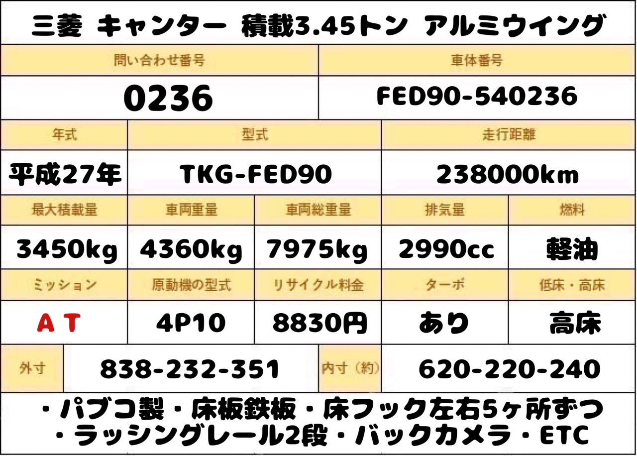 平成27年式 三菱/キャンター 積載3.45トン/増トン! パブコ製/アルミウイング/6200ボディ! 6速AT/高床 ラッシングレール2段/床板鉄板/床フック/バックカメラ/ETC/左電格ミラー/リア観音扉 荷寸620/220/240 間口210/230 ★お問い合わせ番号:0236★