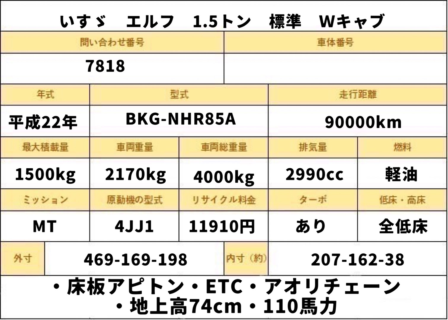 売約済み 平成22年式 いすゞ エルフ 積載1.5トン Wキャブ 全低床 5速MT 荷寸207/162/38 乗車定員6人 ETC アオリチェーン 横滑り防止装置 4ナンバー ★お問い合わせ番号:7818★