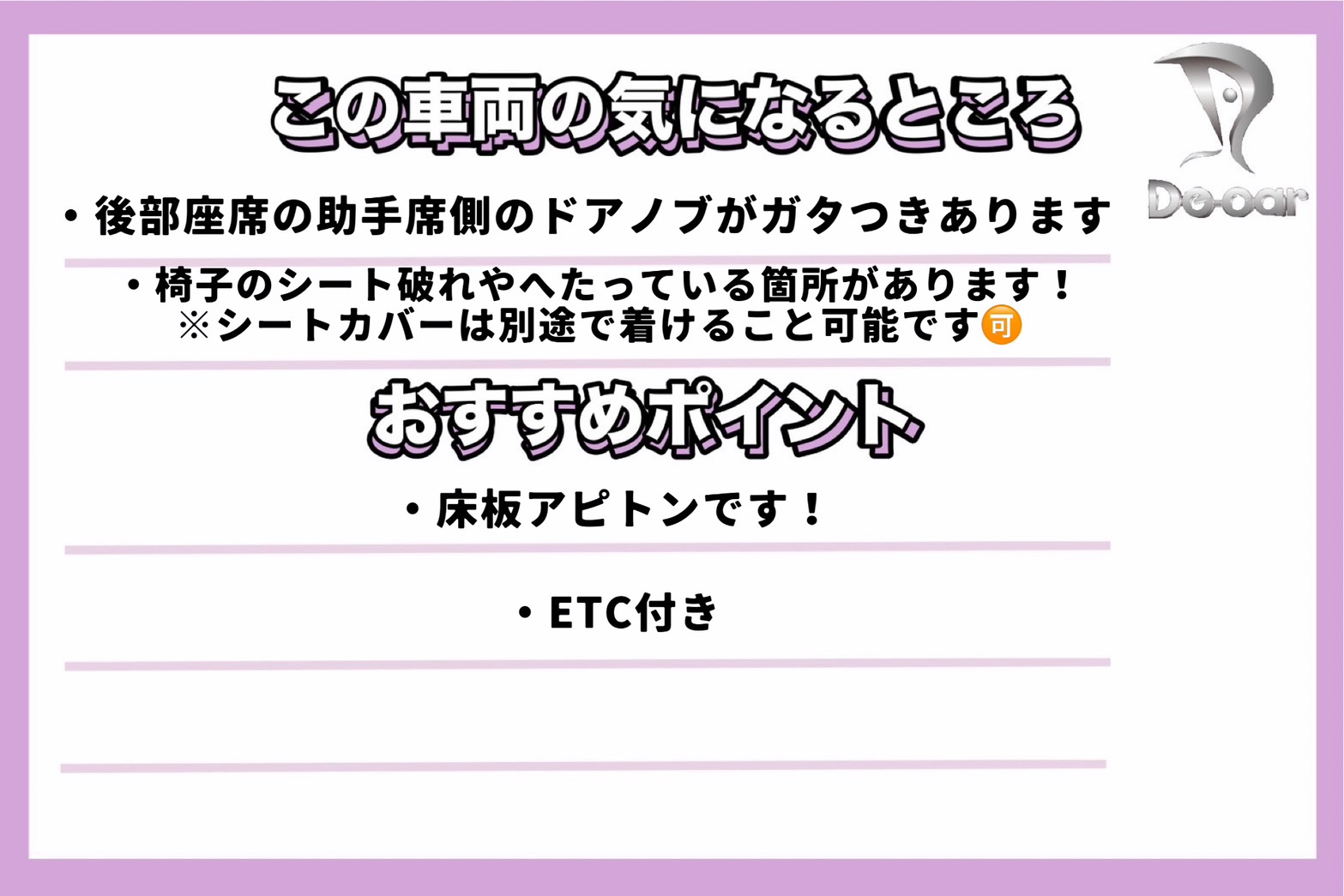 ・掲載車輌はあくまでも中古車でございますので、車両状態に関するご判断は各自個人差があります。当店にて厳正に判断したコ ンディションを記入しておりますが、車両状態を含めた現車のご確認をお勧めいたします。