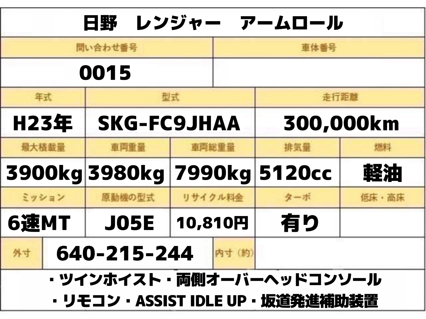 売約済み 平成23年式 日野 レンジャー 積載3.9トン 新明和 アームロール ツインホイスト/リモコン 6速MT 新明和製 リモコン ☆車検令和8年9月28日迄有り☆ ★お問い合わせ番号:0015★