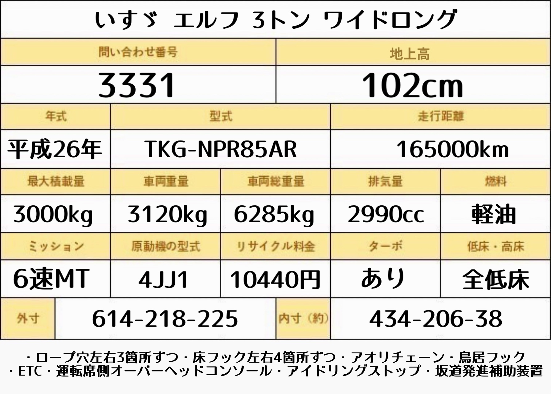・NOX / PM適合・エアコン・パワステ・パワーウィンドウ・エアバック・ロープ穴左右3箇所対・床フック左右4箇所対・ETC・左電格ミラー・鳥居フック・アオリチェーン・坂道発進補助装置・オーバーヘッドコンソール・アイドリングストップ