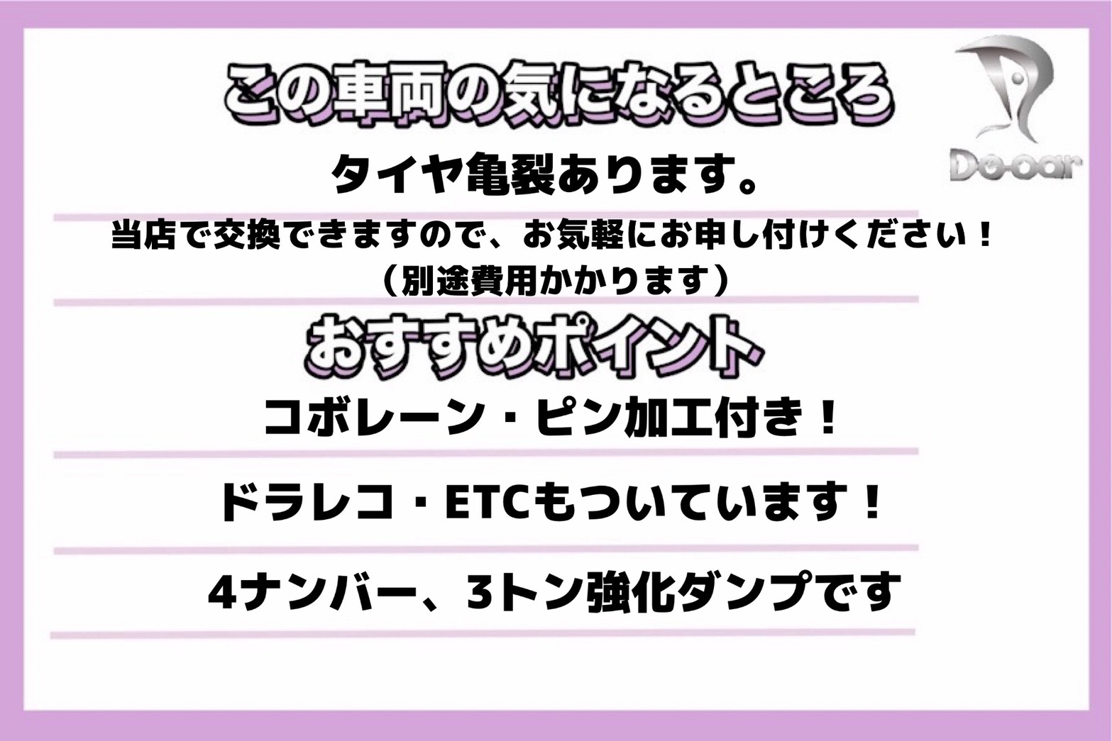 - エアコン、パワステ、パワーウィンドウ、エアバック、ABS、ETC、ドライブレコーダー、あゆみ掛け、ピン加工、コボレーン