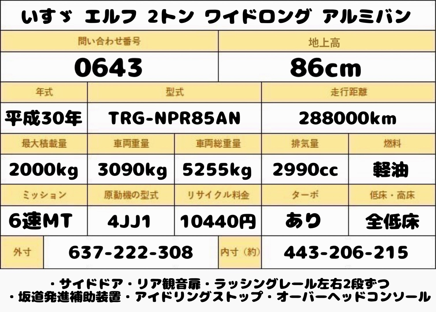- エアコン、パワステ、パワーウィンドウ、エアバック、左電格ミラー、サイドドア、リア観音扉、ラッシングレール、左電格ミラー