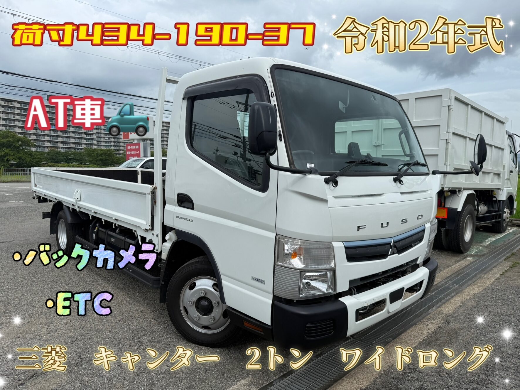 令和2年式(西暦2020年) 三菱/キャンター 積載2トン ワイドロング 全低床/6速AT 乗車定員:3名 4P10エンジン ナビ(SDカード無し)/バックカメラ/ETC/アオリ開閉補助装置(ラクラク君) 床板新品張替え済み! 150馬力 全タイヤサイズ:205/70R16(スペアタイヤなし) 荷寸434-190-37 地上高:87cm ★お問合せ番号:1912★