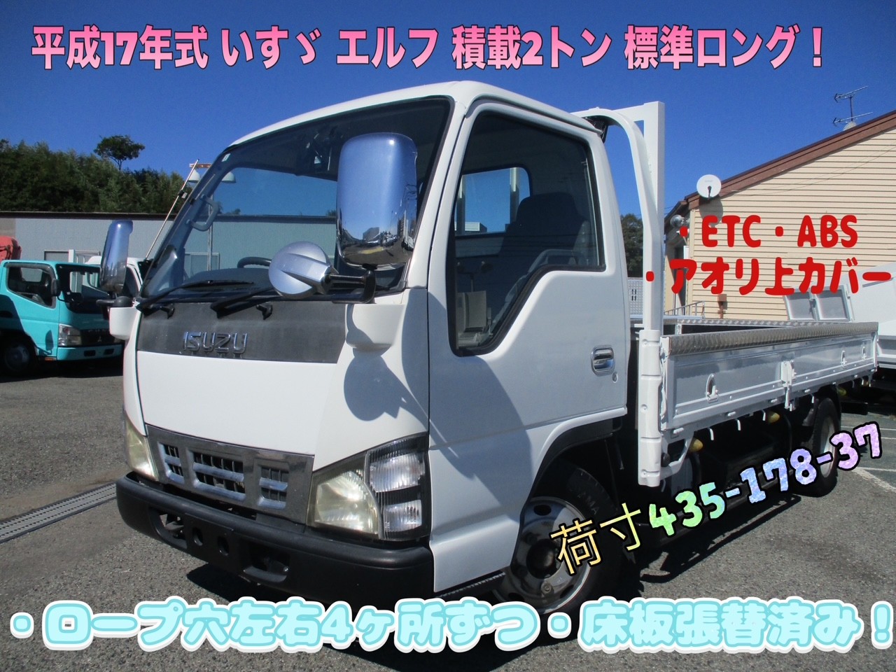 平成17年式 いすゞ エルフ 2トンベース/積載2トン 標準ロング 全低床/5速MT/3ペダル/地上高:87cm 荷寸435-178-37 ロープフック/ロープ穴左右4箇所ずつ/アオリ上カバー/ETC 荷台塗装 ★お問合せ:8914★
