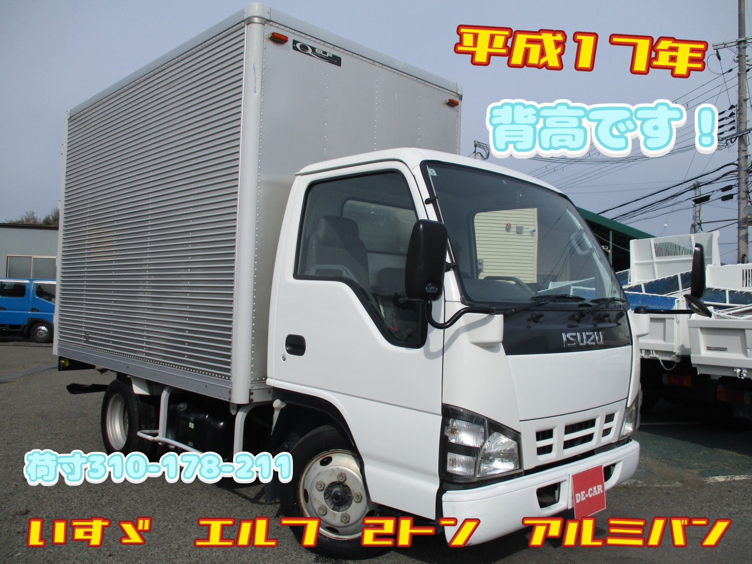 平成17年式 いすゞ エルフ 積載2トン 背高!アルミバン 全低床 5速MT 荷寸310-178-211(間口:幅178-高さ206) ETC ドライブレコーダー ラッシングレール左右1段ずつ 日本フルハーフ製 型式:DLK リア観音扉 ターボ無し 180馬力 ABS 坂道発進補助装置 ASR PS PW エアバック 取扱説明書 スペアタイヤ 集中ロック 4HL1エンジン タイヤサイズ:205/65R16 地上高:86cm NOX適合 ☆車検令和8年5月30日迄有り☆ ★お問い合わせ番号:4873★