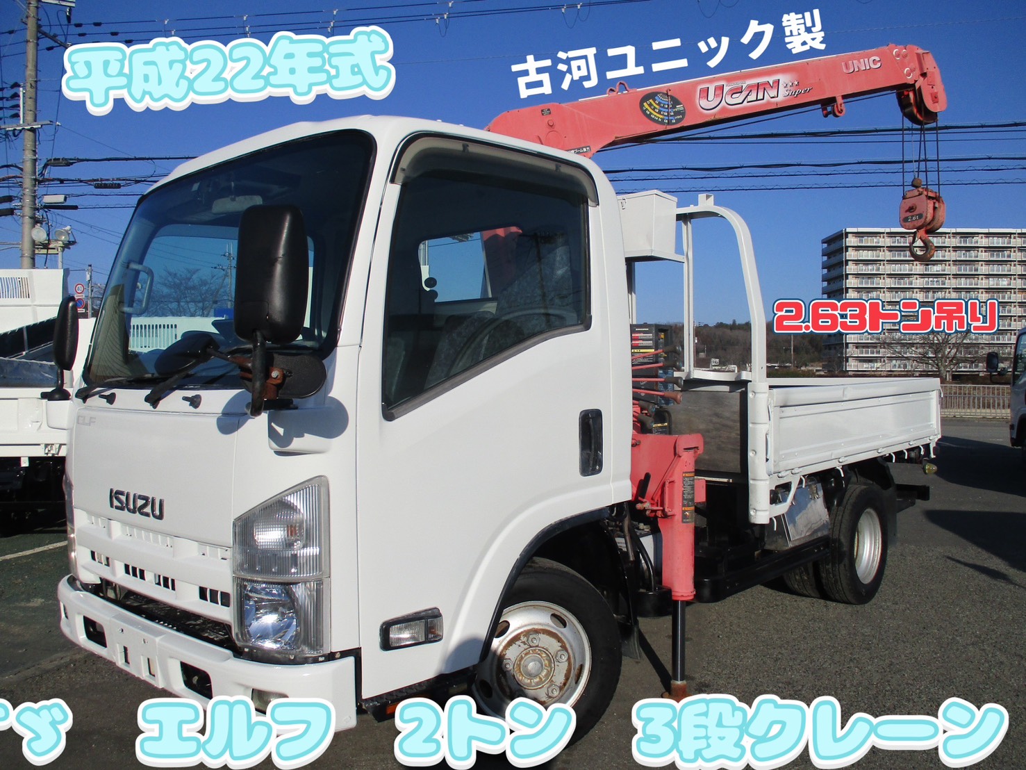 平成22年式 いすゞ エルフ 積載2トン 2.63トン吊り 3段クレーン ラジコン 古河ユニック製 フックイン 6速MT 荷寸265/180/38 床フック左右4箇所対 アオリチェーン ETC ドライブレコーダー アイドリングストップ レベライザ 坂道発進補助装置 バックカメラ 左電格ミラー 床板鉄板 工具箱 ターボ 馬力 地上高:92cm タイヤサイズ:205/70R16 NOX適合 ★お問い合わせ番号:2585★