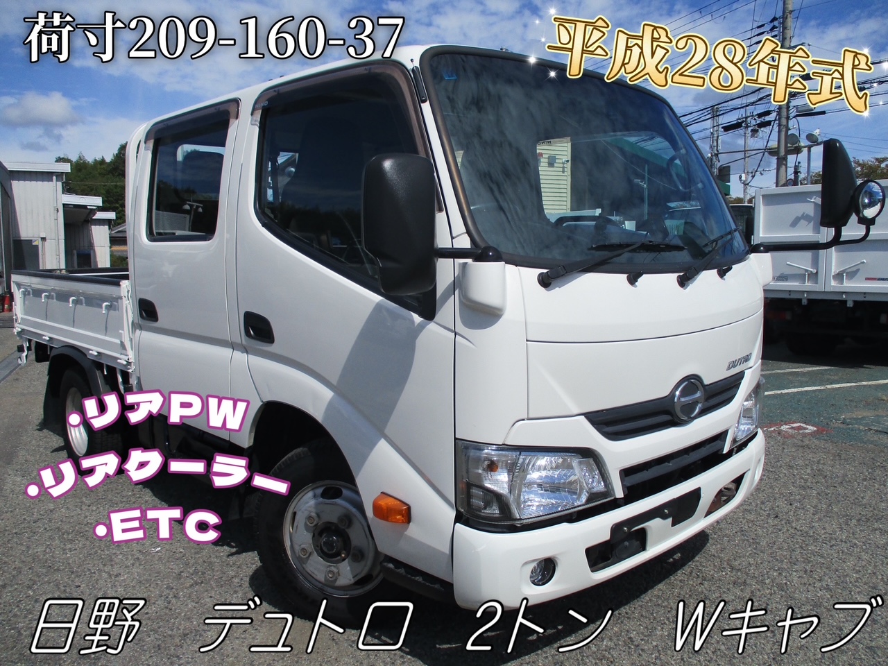 平成28年式 日野 デュトロ 積載2トン ダブルキャブ 全低床 5速MT 荷寸209-160-37 荷台塗装 ETC リアクーラー リアパワーウィンドウ 両電格ミラー ロープフック多数 アオリにもフック多数 両電動ミラー ABS 4ナンバー Wキャブ 2トン車 2トンベース ミラーヒーター ターボ 136馬力 PS PW エアバック スペアタイヤあり 集中ロック N04Cエンジン 乗車定員:6人 地上高:84cm タイヤサイズ:195/75R15 NOX適合 ★お問い合わせ番号:3621★
