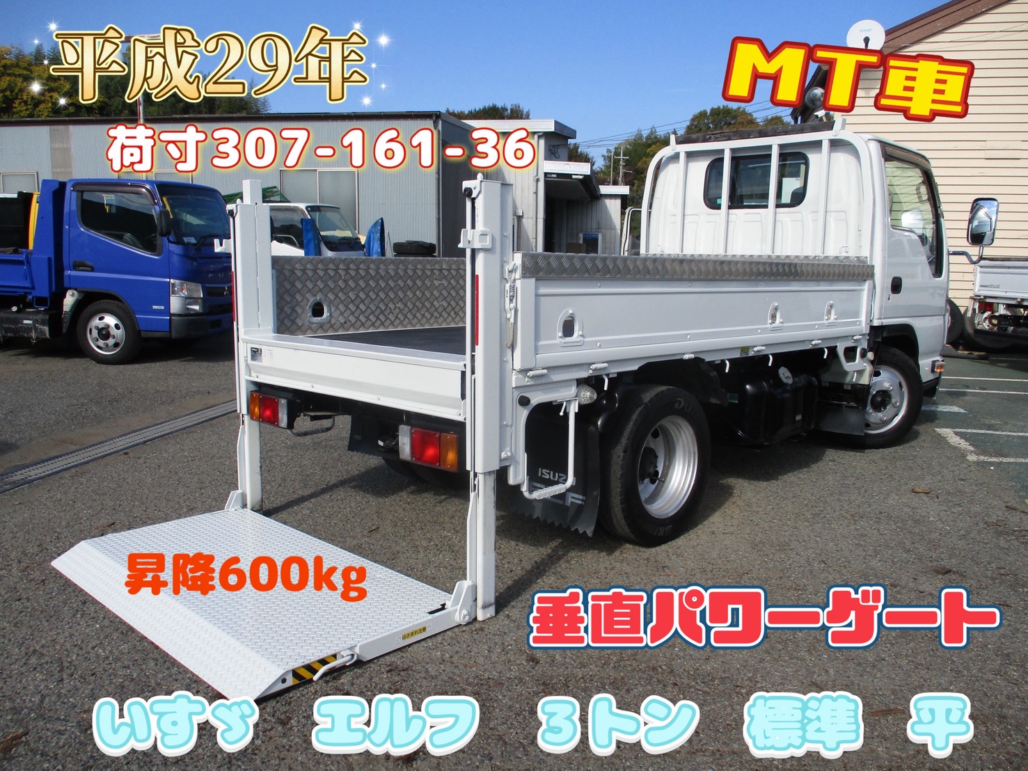 平成29年式 いすゞ エルフ 2トンベース積載3トン 標準 平ボディ 新明和製 MODEL:RE06-1133 垂直パワーゲート 最大昇降600kg 全低床 6速MT 荷寸307-161-36 PG面158-70(84)PG リモコン有り 床板新品張替え済み! アオリ内側アルミ縞板 アオリ上アルミ縞板 鳥居アルミ縞板 メッキパーツ ロープ穴左右3ヶ所ずつ バックカメラ ETC ナビ フルセグ 4ナンバー 坂道発進補助装置 150馬力 地上高86cm タイヤサイズ:205/70R16 NOX適合 ★お問い合わせ番号:7117★